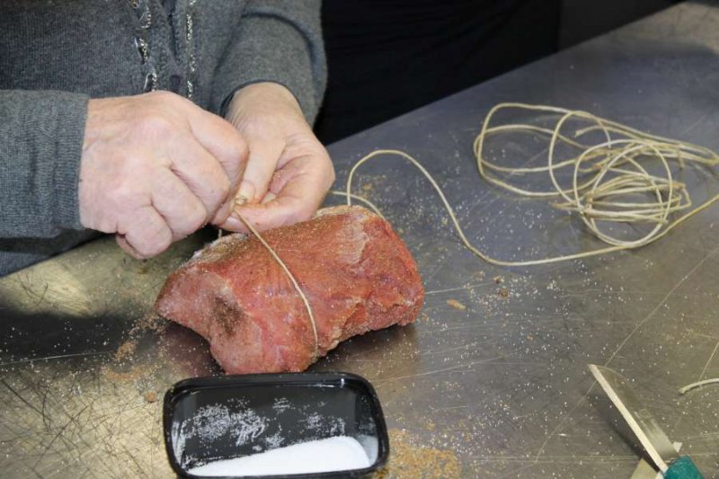 Het was een hele grote groep. Daarom gingen we eerst in de schuur, waar iedereen werd ontvangen met een kopje koffie en een plak cake. Daarna werd de groep in tweeën gesplitst. De ene helft bleef in de schuur onze bedrijfsfilm kijken. De andere helft ging aan het werk in de keuken. Iedereen mocht zelf een rollade kruiden en proberen met de hand te knopen. Dat het nog een heel gepruts was , had lang niet iedereen gedacht. Wie klaar was kon hem in de winkel vacumeren en aan het einde van de avond mee naar huis nemen.